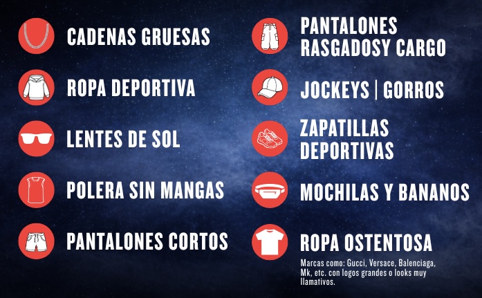 Para mujeres: se permite el uso de shorts, pantalones cargo, poleras sin mangas y bananos.